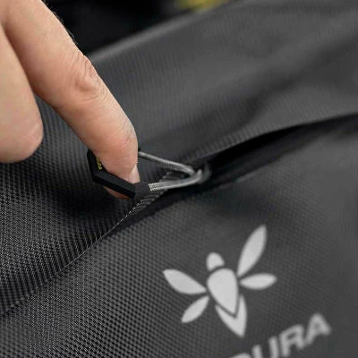 La petite sacoche est usinée à partir d’un laminé 3 couches étanche, léger et robuste, créé uniquement pour les besoins d’Apidura. Il est constitué d’une couche imperméable avec revêtement PU, d’une couche de nylon durable et d’un film léger TPU. Les coutures de la sacoche sont soudées pour former un joint étanche et la fermeture Éclair qui ouvre et ferme la sacoche est protégée par un rabat. Des éléments qui rendent la sacoche Expédition 100% imperméable et étanche. De plus, le laminé est extrêmement résistant aux déchirures et aux abrasions.